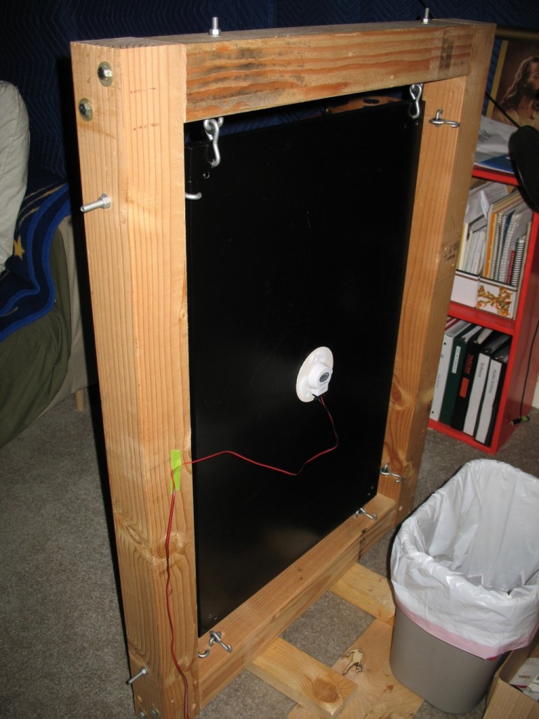 I drilled holes in the plate and attached it to the frame using some crazy screw/hook/bolt fasteners I found at the hardware store. These would hold the plate at each corner and by tightening the bolts, stretch the plate, to “tune” it.