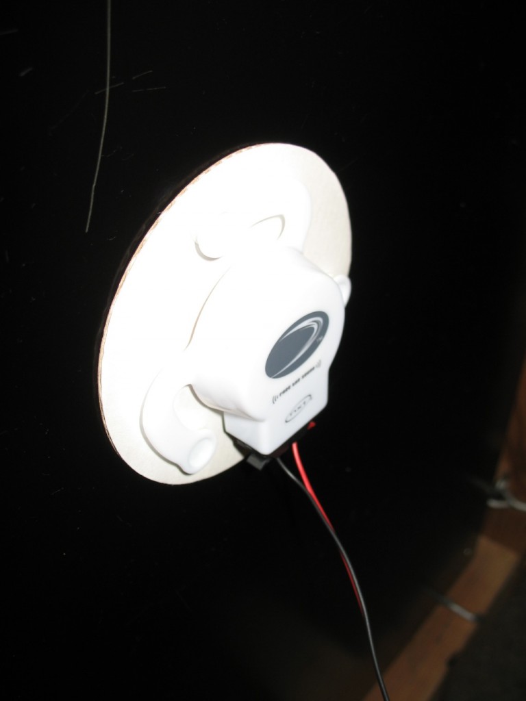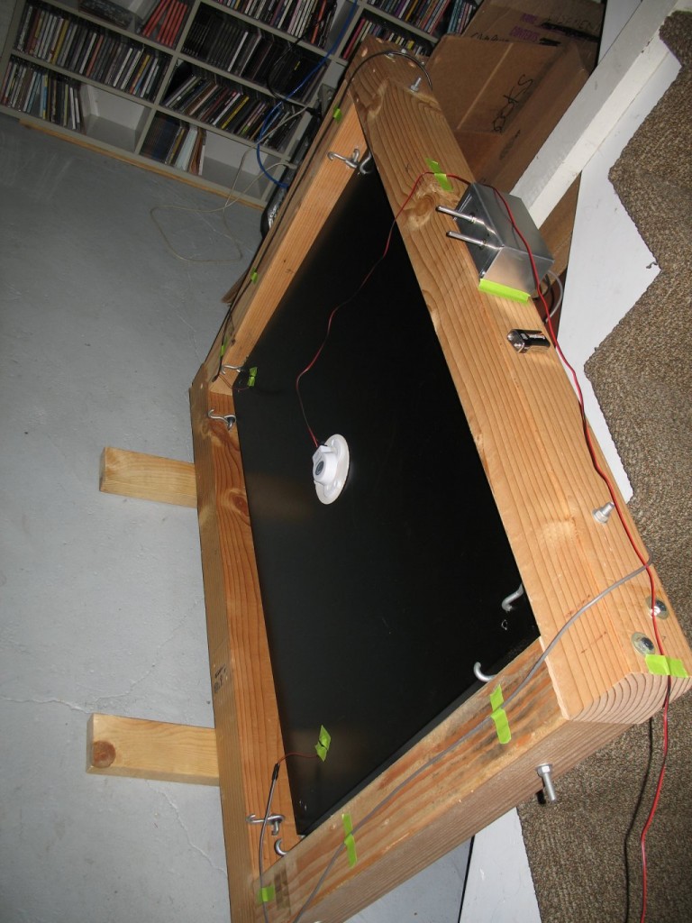 Next was the driver. I had seen online that others had success using a “contact speaker” to drive a plate. I bought a couple of those and stuck one of them onto the plate. To drive the speaker I needed an amplifier of some sort. I don’t recall exactly what I used but I had an amp of some kind and wired it in place (probably my old Sunn PA head).